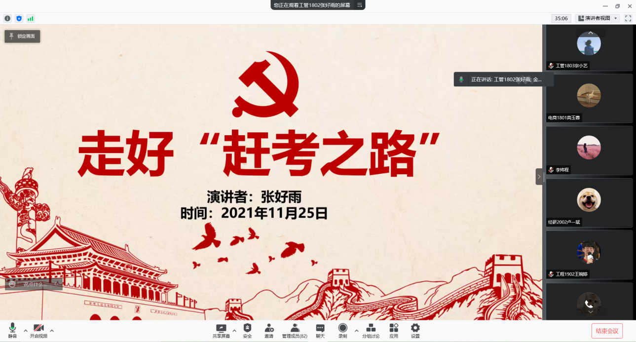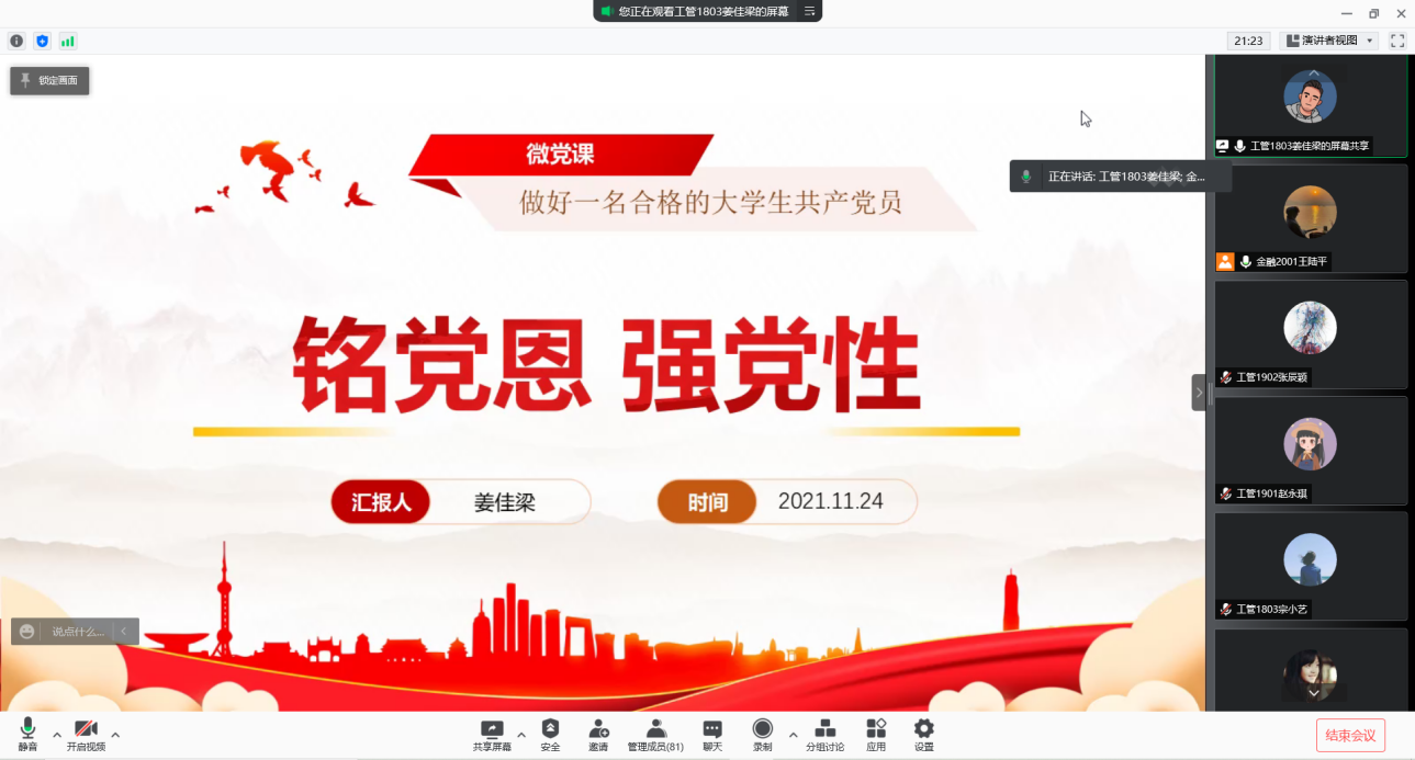 铭党恩、强党性,做合格党员。姜佳梁以员工党员身份出发,提醒大家要时刻牢记自己共产党员的身份,充分发挥先锋模范作用,从树立终身学习的理念、弘扬革命传统、强化责任担当三个方面做好合格党员。忆“赶考之路”,奋进第二个百年奋斗目标。张好雨同学与大家分享了“赶考之路”的起源,讲述了中国共产党人矢志不渝的赶考路,激励青年员工党员要勇敢接过艰苦奋斗的接力棒,用热血挥洒青春。