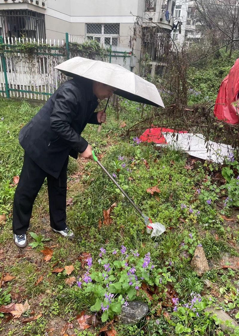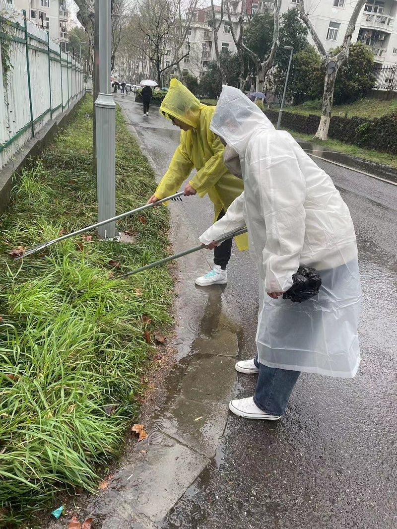 在有序的规划与分工下,师生对西苑宿舍区进行了全面清理。针对区域面积不规则、角落地带难清理的特点,采用划片划域的方式开展打扫。绵绵细雨丝毫不影响劳动热情,老师和同学协同劳动,一齐打扫,有人使耙、有人使夹、有人撑着垃圾袋装取清扫的垃圾和落叶。一番劳作下,不仅手中的工具由陌生变得熟悉,志愿者们也从陌生人变成好朋友,校园在欢声笑语中变得更加整洁美好。