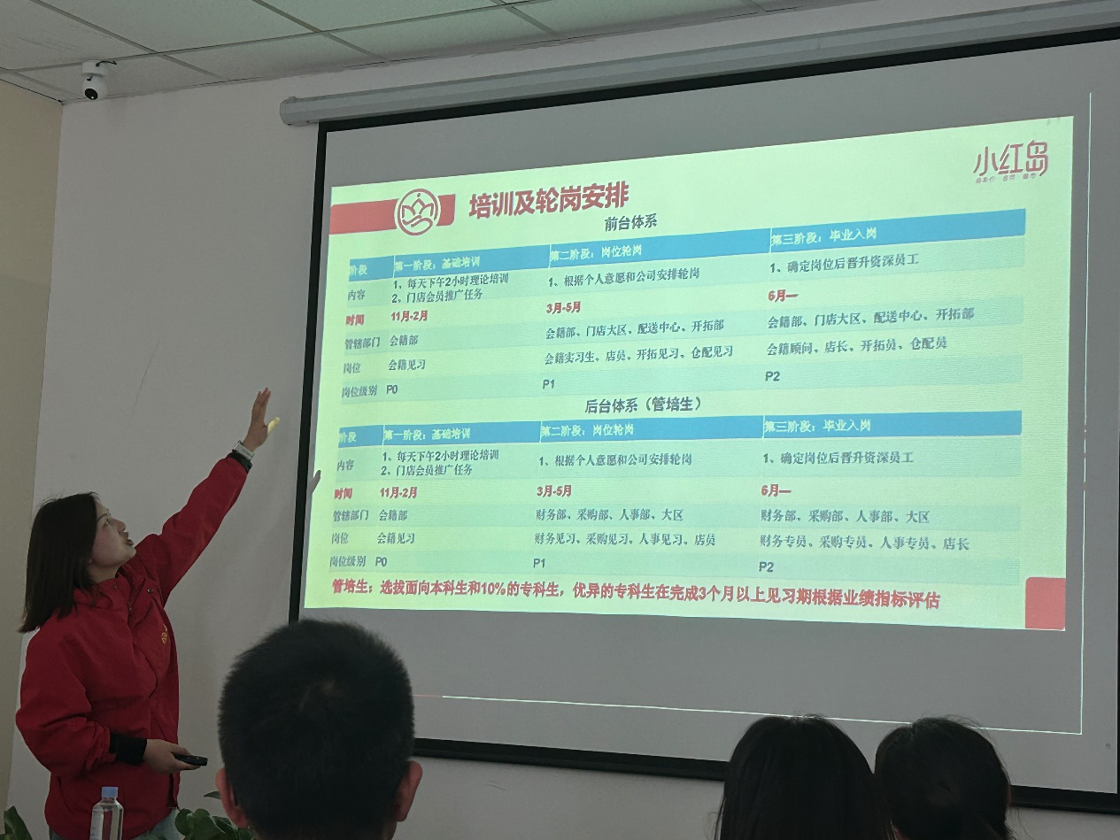 公司一行参观了企业自创第六代社区会员超市门店,实地了解小红岛超市的经营理念;走进公司为员工们提供的人才公寓,了解住宿环境;在公司本部,大家一一走访了配送中心、仓储环境、物流供应、工作环境等。随后,公司创始人、公司2011届员工顾以问总经理用诙谐幽默的方式向同学们讲述自己的创业发展史,遇到的挑战、变革和成长,与会的同学们获益匪浅。公司大区经理、公司2007届员工陈侃结合自己毕业后的就业经历,建议同学们积极就业,要做一个对社会有价值的人。公司财务总监朱晶结合自身经历从财务视角介绍了公司的营运。高管们的就业经历和创业经验的分享让在场的员工受益良多。最后,企业招聘负责人介绍了校招需求岗位及其提供的管培生培养计划,现场与意向同学做了交流和互动,同学们对公司表达出了极大的意愿。