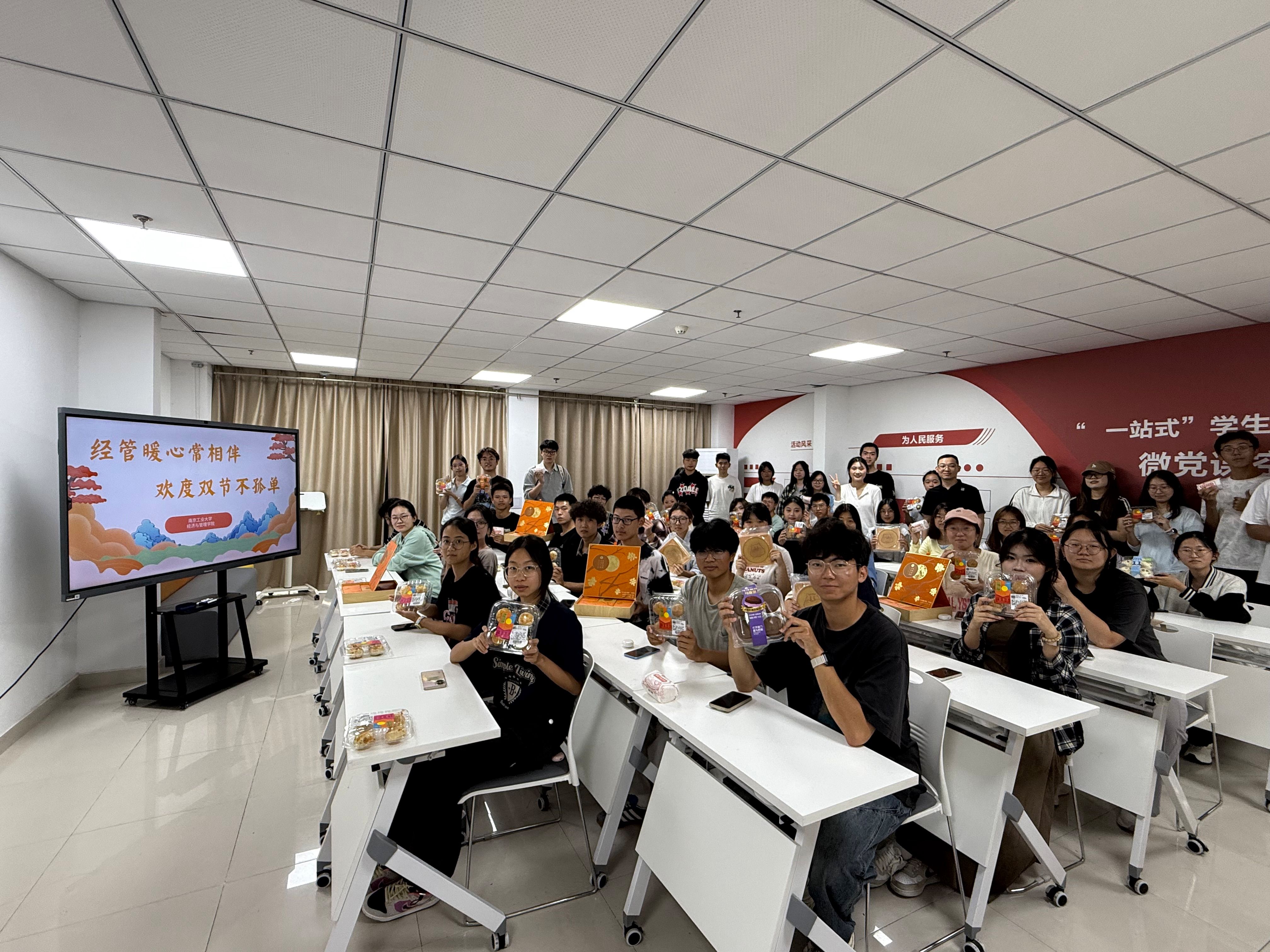 月满中秋,情满人间,但有部分新生第一次远行,不能和家人团聚。公司特在南苑一站式社区举办慰问活动。活动以“经管暖心常相伴、欢度双节不孤单”为主题,公司老师与留校员工代表一起欢度佳节。