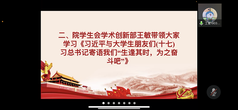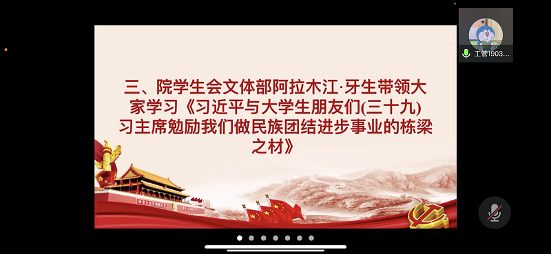 会上,院员工会综合事务部岳钰茜带领大家学习《习近平与老员工朋友们(十一)习书记鼓励我争做自主创新的“排头兵”》,鼓励同学们激发自身蕴藏的创新热情和创造潜力,将个人的追求同广大同学的需要紧密联系起来。院员工会学术创新部王敏带领大家学习《习近平与老员工朋友们(十七)习总书记寄语我们“生逢其时,为之奋斗吧”》,希望同学们珍惜宝贵的青春年华,坚持理想,把握时代的机遇,勇于探索,不懈奋斗。院员工会文体部阿拉木江·牙生带领大家学习《习近平与老员工朋友们(三十九)习主席勉励我们做民族团结进步事业的栋梁之材》,指出同学们应砥砺意志品质,为实现中华民族伟大复兴的中国梦而努力奋斗!。