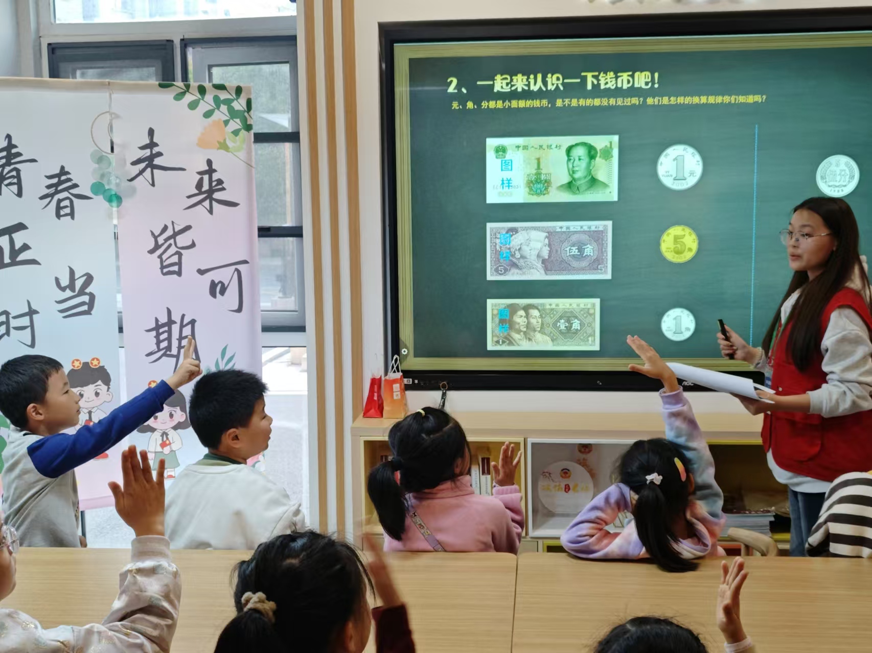 活动在志愿者们精心准备的PPT讲解中拉开序幕,小朋友们被带入了一场穿越时空的货币之旅,从古老的贝壳货币到现代的电子支付,每一个时代的货币变迁都蕴含着生活的智慧。志愿者们引导小朋友们围绕“如何赚钱花钱”展开热烈讨论,小朋友们纷纷化身小小理财家,畅谈自己的储蓄与消费计划。