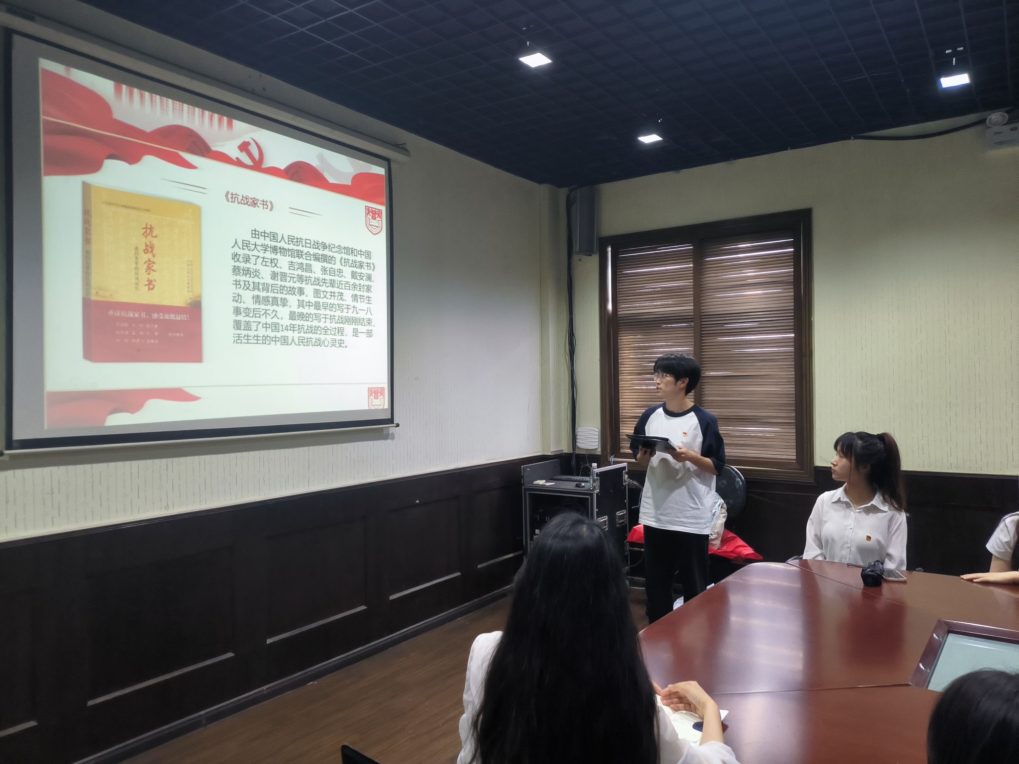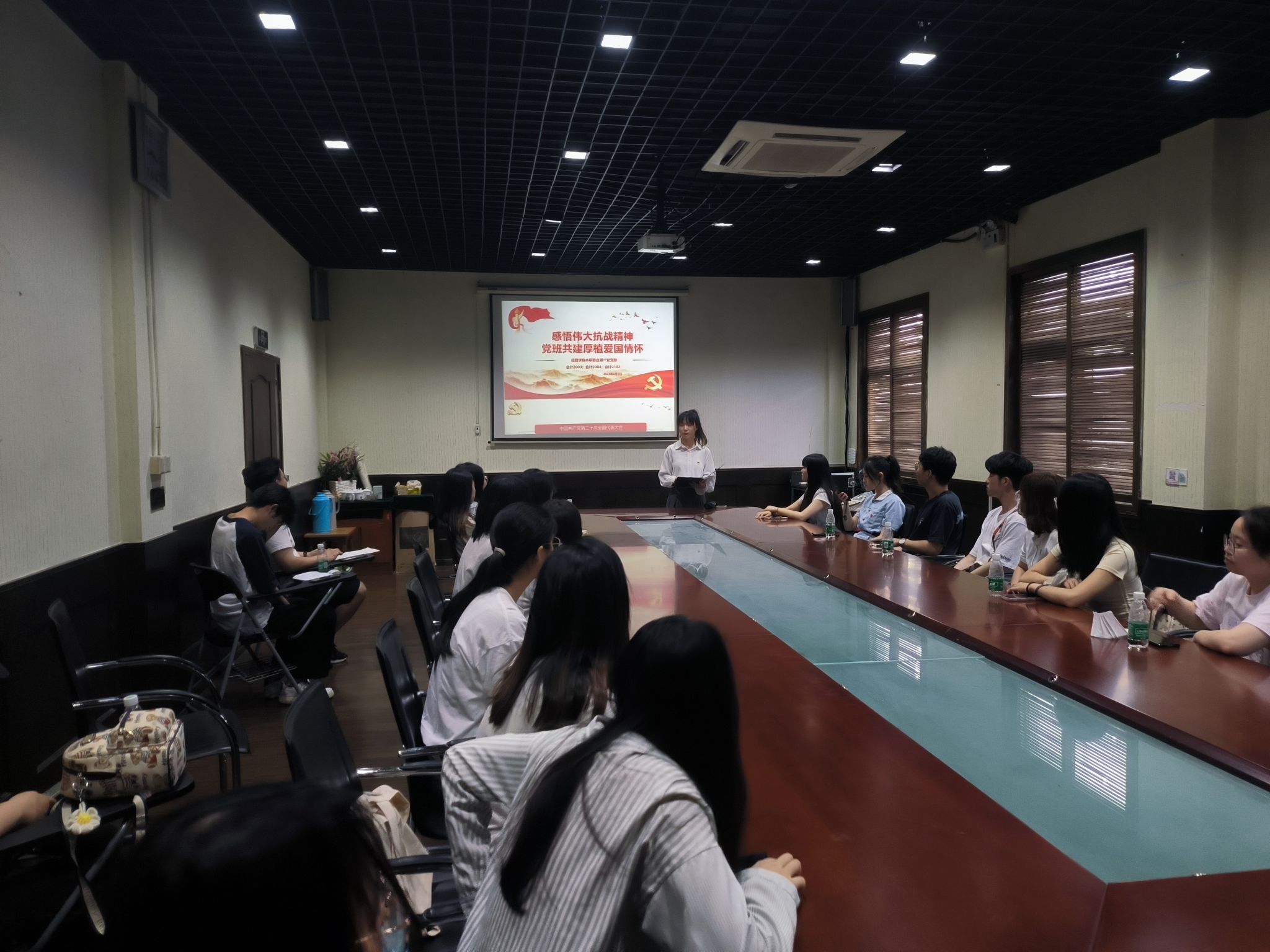 在博物馆会议室,支部党员陈奕名、李腾同志分别做了抗战中流砥柱和抗战中的家书主题分享,随后会计2003班和会计2004班班长叶小茹、李玥萱做了班级建设经验展示,会计2102班同学就弘扬伟大抗战精神、助推党团班一体化建设进行交流讨论。